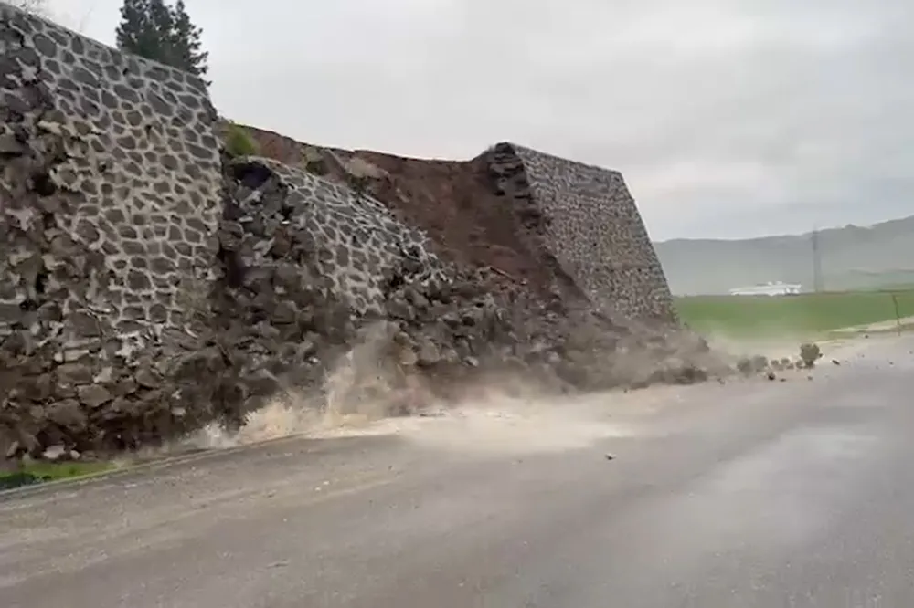 Şırnak'ın Cizre ilçesinde yaşanan yoğun yağış nedeniyle bir istinat duvarı çöktü. şans eseri kimsenin yaralanmadığı olay, bölgedeki vatandaşlardan biri tarafından cep telefonu ile kayda alındı.