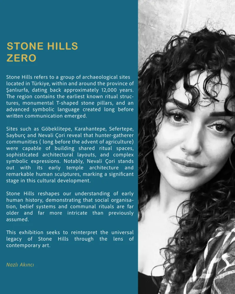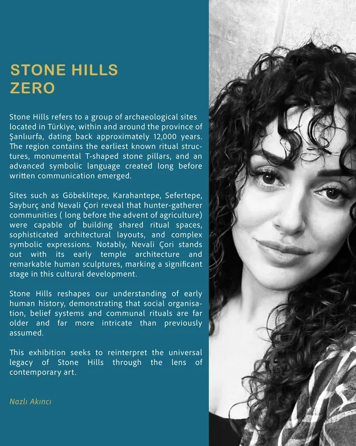 Nazlı Akıncı’nın bu özel serisi, Türkiye’nin Şanlıurfa bölgesinde yer alan ve yaklaşık 12.000 yıl öncesine tarihlenen Stone Hills (Taş Tepeler) arkeolojik alanlarından ilham alıyor. Göbeklitepe, Karahantepe, Sefertepe, Sayburç ve Nevali Çori gibi insanlık tarihini yeniden düşünmemize neden olan merkezler; sergide çağdaş sanatın özgün diliyle yeniden yorumlanıyor. Yazıdan önceye uzanan sembolik düşünce, ritüel mekânlar ve kolektif hafıza, Akıncı’nın eserlerinde zamansız bir anlatıya dönüşüyor.