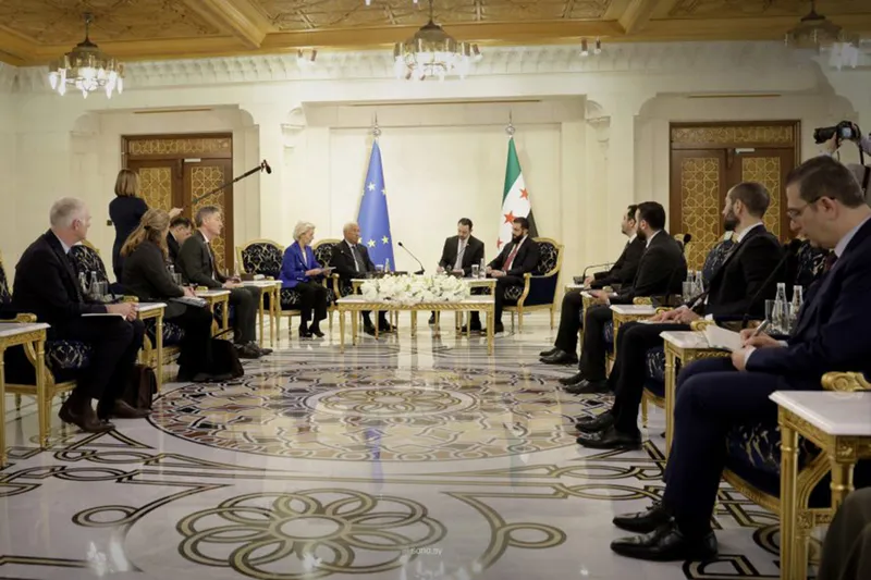 Şam'daki Halk Sarayı'nda Avrupa Konseyi Başkanı Antonio Costa ve Avrupa Komisyonu Başkanı Ursula von der Leyen ile beraberlerindeki heyeti, Dışişleri ve Yurtdışındakiler Bakanı Asaad Hassan el-Şeibani'nin de hazır bulunduğu bir törenle kabul etti.