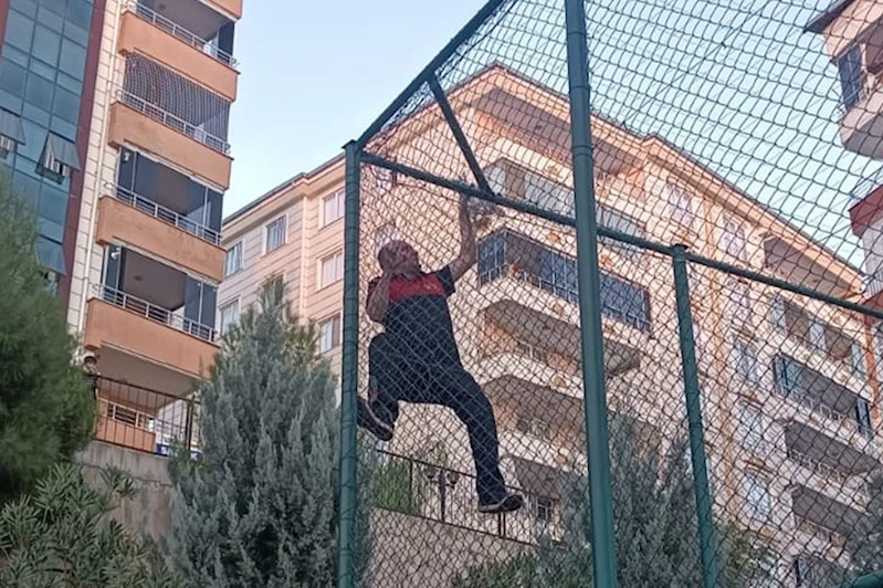 Site sakinleri, çim saha tel örgülerinin arasında sıkışıp çıkamayan yavru kediyi fark ederek durumu itfaiyeye bildirdi.