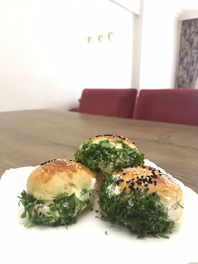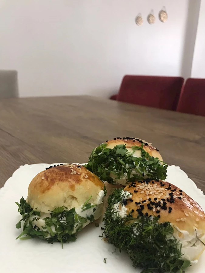 Soğuyan sandviçleri enlemesine ortadan ikiye bölün arasına beyaz peynirli karışımdan bolca sürün ve son olarak uçlarını maydanozlu kaşar peyniri ile kaplayıp servis edin.