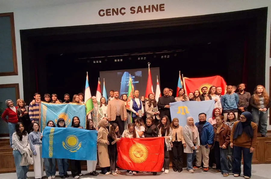 Sahnede Türk dünyasının bayrakları ve anayurt marşı eşliğinde toplu hatıra fotoğrafı çekildi.