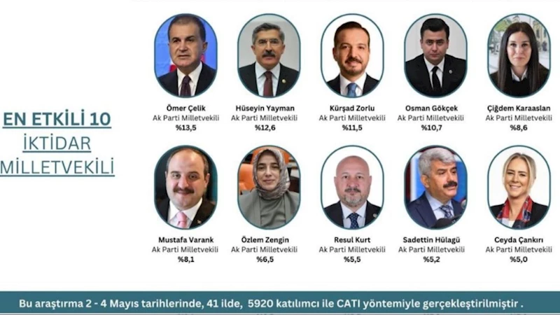 Araştırma sonucuna göre, AK Parti Adıyaman Milletvekili Resul Kurt, Türkiye genelinde en etkili 10 iktidar milletvekili arasında yer aldı. Listenin diğer isimleri arasında Ömer Çelik, Hüseyin Yayman, Kürşad Zorlu, Osman Gökçek, Mustafa Varank, Özlem Zengin, Çiğdem Karaaslan, Saadettin Hülagü ve Ceyda Çankırı gibi önemli siyasetçiler de bulunuyor.