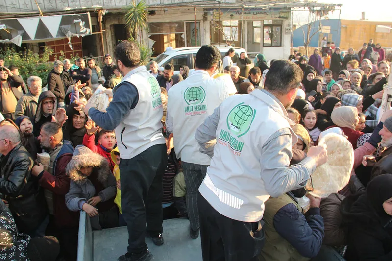 Suriye'de yardım faaliyetlerinde bulunan Umut Kervanı, hayatta kalma mücadelesi veren yüzlerce savaş mağduru aileye insani yardım malzemeleri dağıttı.
