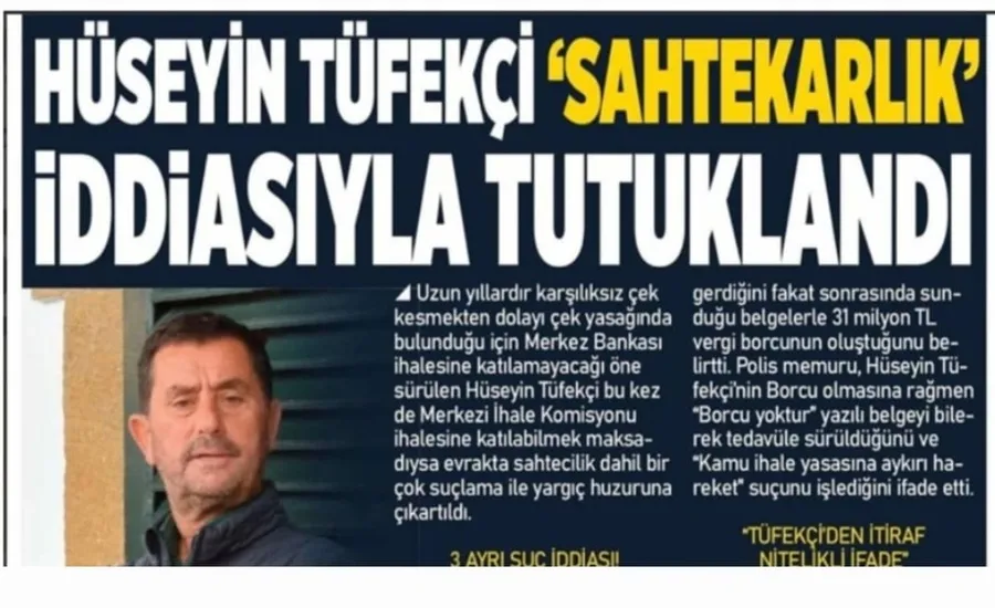 ÜNAL ÜSTEL'İN vazgeçilmezi olan Hüseyin TÜFEKÇİ, Merkezi İhale Komisyonu (MİK) tarafından açılan Yeni Merkez Bankası binası ihalesine katılmak üzere “sahte belge / bilanço usulsüzlüğü” yaptığı iddiaları çerçevesinde 4 Şubat 2025’te tutuklandı.