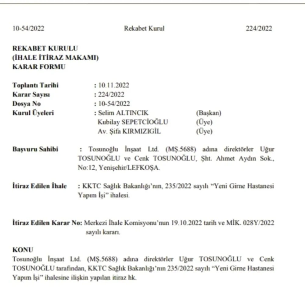 Ne ki, elenen Tosunoğlu İnşaat şirketi, Selim ALTINCIK başkanlığındaki Rekabet Kurulu'na itiraz etti ve haklı bulundu.