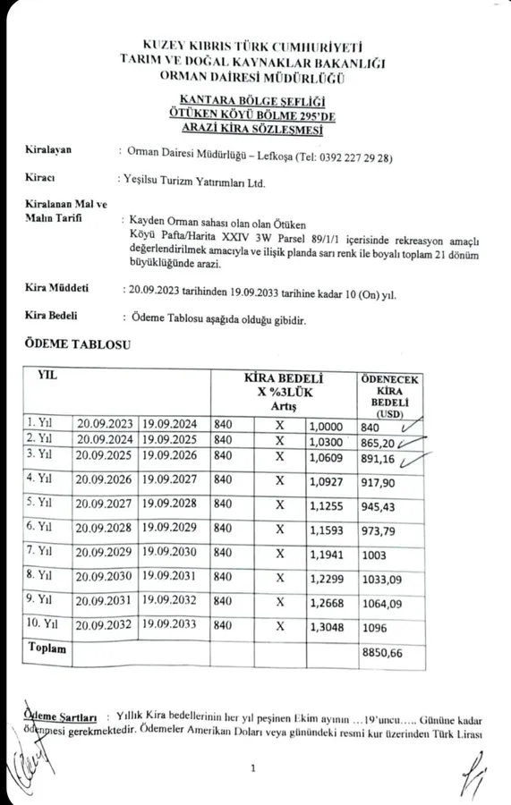 EYLÜL 2023'DE İMZALANAN SÖZLEŞME İLE, YILDA DÖNÜMÜ 40 DOLARDAN YILDA 840 DOLAR KİRA İLE 2033 YILINA DEK PEŞKEŞ ÇEKİLEN ARAZİYE, TALİMATLA HAREKET EDEN İSKELE BELEDİYESİ DE, YASALARI ÇİĞNEYEREK İNŞAAT RUHSATI VERDİ.