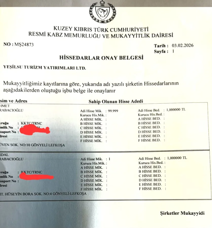 Buna göre sahibi 99.999 hisseye sahip Gönyeli sakini Ahmet Arabacıoğlu.
