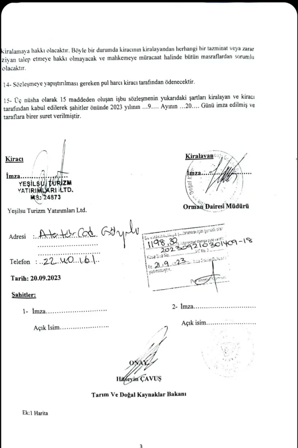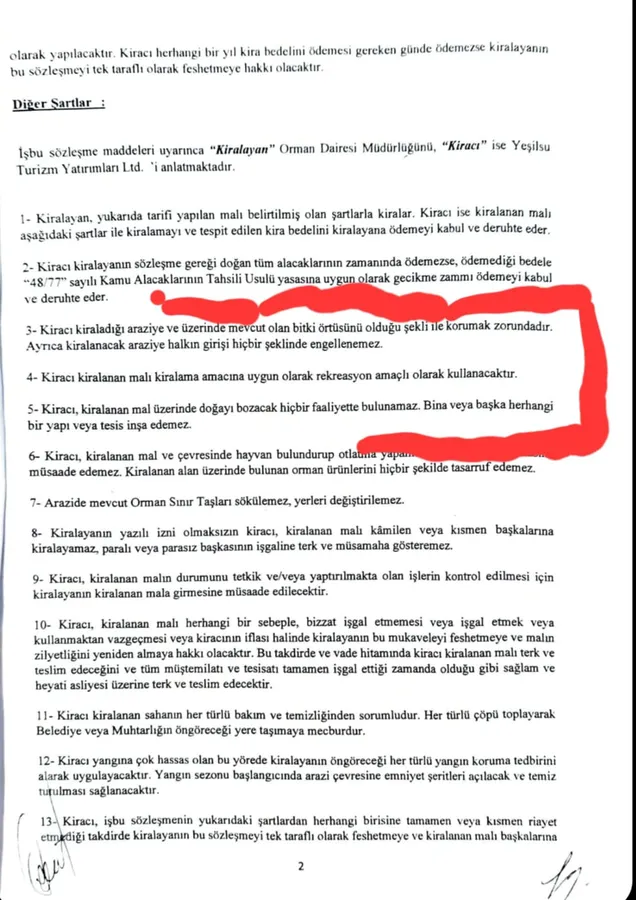 Sözleşmenin 3. maddesinde, kiracının arazi üzerinde bitki örtüsünü koruyacağı yazıyor ama ağaçlar ve bitki örtüsü ilk günden dozerle yok edildi ( BELGE 2 VE VİDEO- FOTOĞRAFLAR)