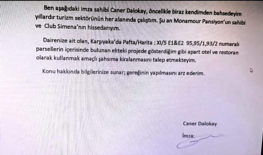Dairenize ait olan, Karşıyaka’da Pafta/Harita: XI/5 E1&E2 95,95/1,93/2 numaralı parsellerin içerisinde bulunan ekteki projede gösterdiğim gibi apart otel ve restoran olarak kullanmak amaçlı şahsıma kiralanmasını talep etmekteyim.