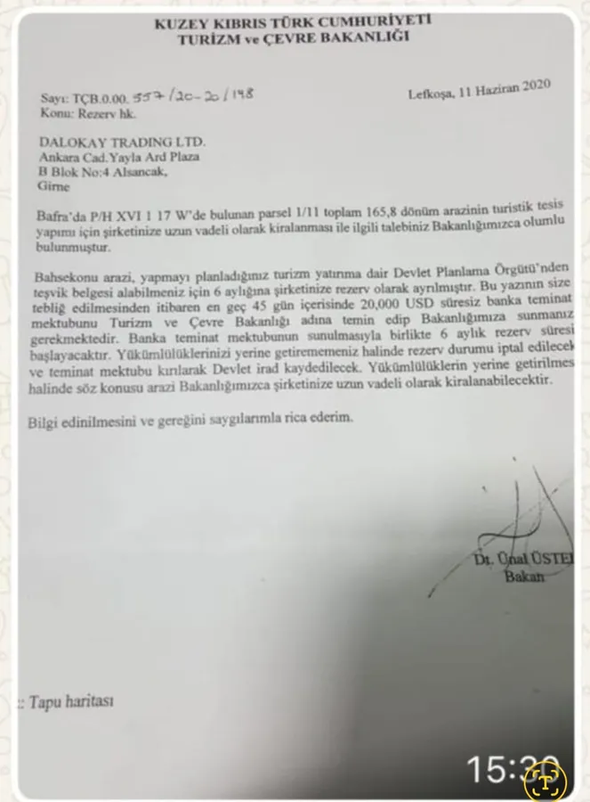 " Bafra ve Karşıyaka’da talep ettiğimiz araziler konusunda yazdıklarınız doğrudur. O arazilerin talep yazısını ben yazdım, Caner Dalokay da imzaladı, çünkü o bu yazıları yazacak eğitime ve  bilgiye sahip değil. Müracaatları da Ünal Üstel'e ve Devlet Emlak ve Malzeme Dairesi'ne ben götürdüm, elimle verdim. Ünal Üstel, Bafra’daki 165 dönüm araziyi bize verdiğini bildiren 11 Haziran 2020 tarihli yazıyı, görevden alındığı  19 Haziran 2020'den 1 gün önce bizzat bana verdi. Bakanlıktan gitmeden bu işimizi halletti. 150 bin sterlin konusunda ise, bugün değil günü geldiğinde konuşacağım, ifade gerekirse ifade de veririm. Yalan söyleyen ben değil, Caner Dalokay'dır. Bunu herkes bilir. Bu konuda tüm belgeler ve yazıların orijinalleri bendedir, ama şimdi söyleyecek birşeyim yoktur, günü geldiğinde konuşacağım, kimseden de bir korkum yoktur...."