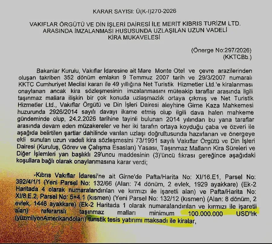 BAŞBAKAN ÜNAL ÜSTEL TARAFINDAN BAKANLAR KURULU'NA SUNULAN "297/2026" SAYILI ÖNERGE ÇERÇEVESİNDE 18 ŞUBAT 2026'DA ALINAN " Ü ( K-I) 270-2026" SAYILI KARARA GÖRE, MERİT DİAMOND HOTELİ İLE MARE MONTE YOLU ARASINDAKİ 82 DÖNÜM 5 EVLEK VAKIF ARAZİSİ, AYDA 2500 STERLİN KİRA İLE MERİT GURUBU'NA KİRALANDI.