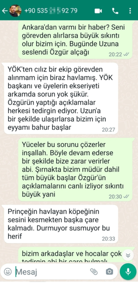 Rektör: “YÖK’ten cılız bir ekip görevden alınmam için biraz havlamış. YÖK başkanı ve üyelerin ekseriyeti arkamda sorun yok çok şükür. Özgürün yaptığı açıklamalar herkesi tedirgin ediyor. Uzun’a bir şekilde ulaşırlarsa bizim için eyyamı bahur başlar”