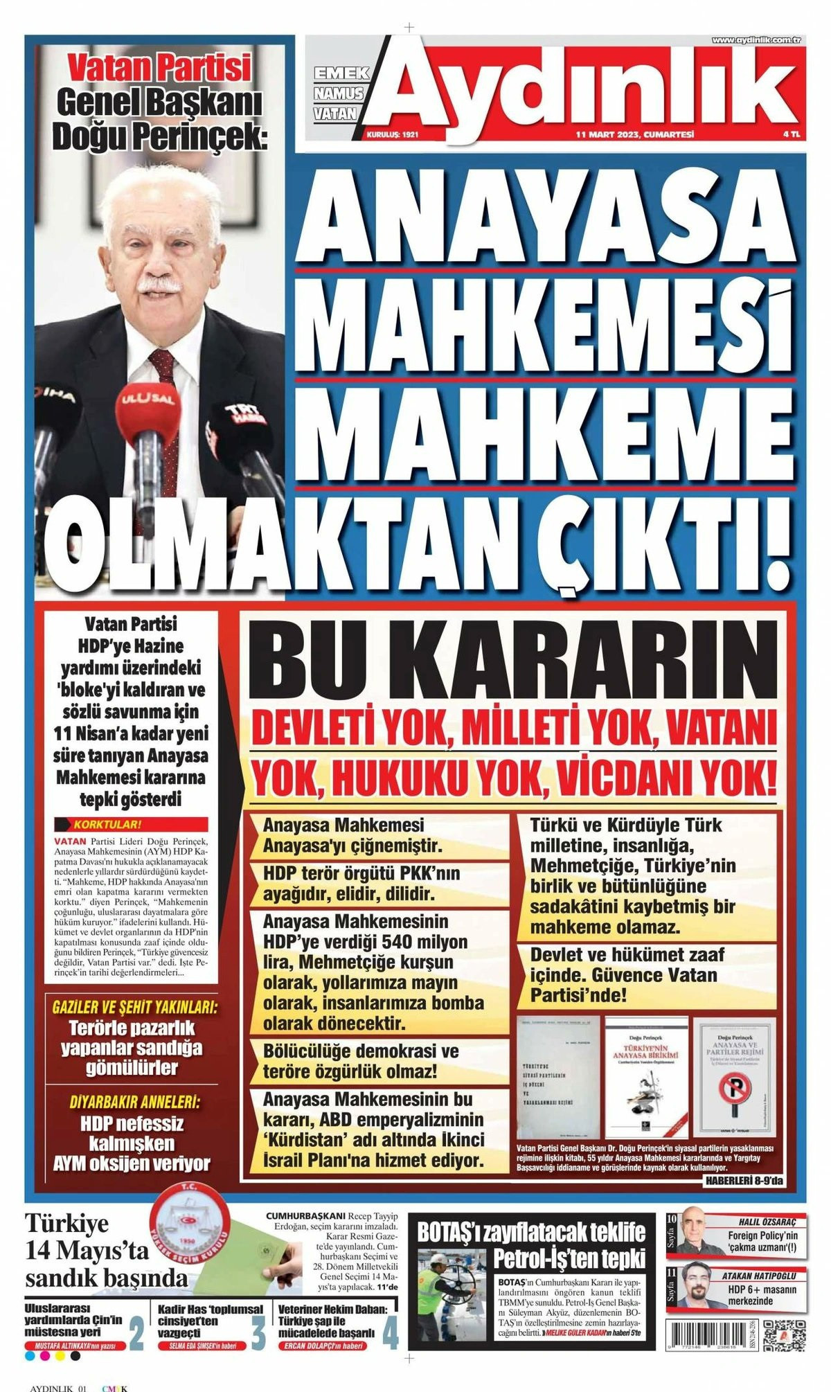 Vatan Partisi Genel Başkanı Doğu Perinçek, Ulusal Kanal yayınında Yargıtay’ın kararını değerlendirdi. Anayasa Mahkemesinin zaaf içindeki kurumların başında geldiğini HDP’yi kapatmadığını belirten Perinçek “Anayasa Mahkemesi çoğunluğunun bölücü teröre destek veren kararlarını yıllardır mahkeme önünde toplanarak protesto ettik, nöbetler tuttuk. Bu tarihî duruşumuz kutsaldır ve yenilmezdir.” dedi.