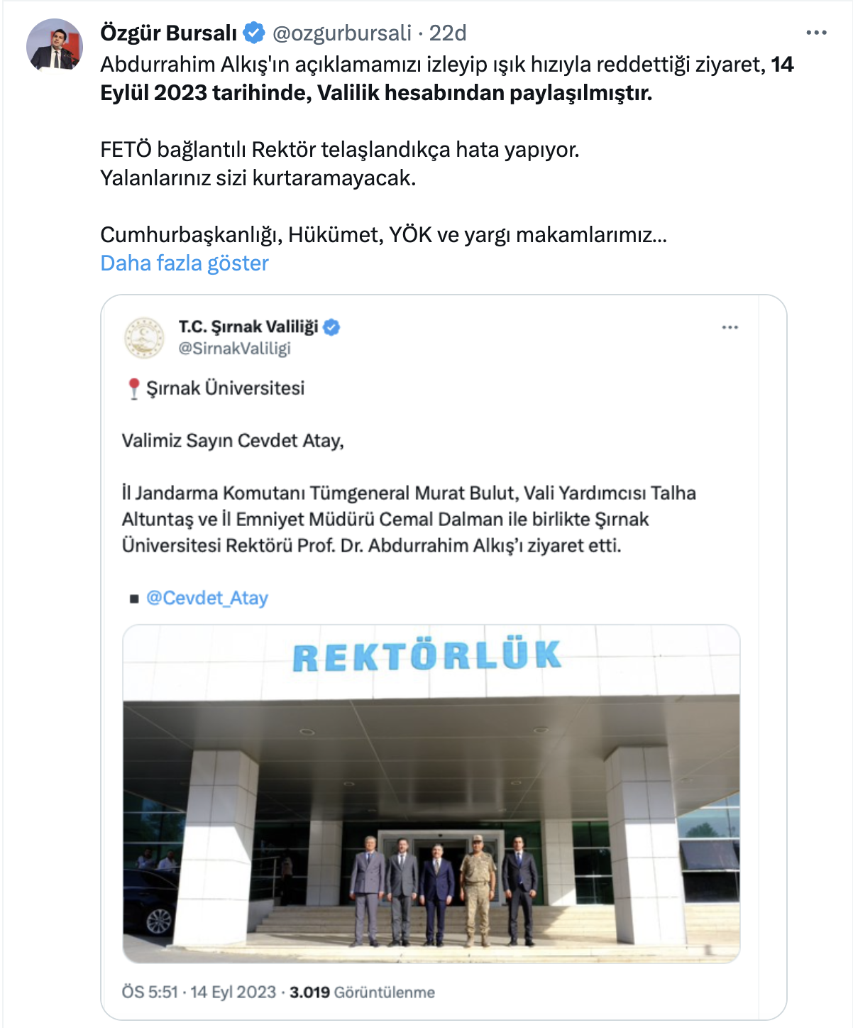 Rektörü Alkış, Bursalı’nın dünkü açıklamasının hemen ardından sosyal medya üzerinden bir açıklama yaptı. “Az önce Vatan Partisi Genel Sekreteri Özgür Bursalı Ulusal kanalda başkası tarafından yalanlar üzere inşa edilmiş olan bir metin okudu. İl protokolümüz tamamen yeni atanan isimlerden müteşekkildir. Yeni protokol henüz iade-i ziyaret gerçekleştirmemiştir.” diyen Alkış’a Bursalı şöyle yanıt verdi: “Abdurrahim Alkış'ın açıklamamızı izleyip ışık hızıyla reddettiği ziyaret, 14 Eylül 2023 tarihinde, Valilik hesabından paylaşılmıştır. FETÖ bağlantılı Rektör telaşlandıkça hata yapıyor. Yalanlarınız sizi kurtaramayacak. Cumhurbaşkanlığı, Hükümet, YÖK ve yargı makamlarımız gereğini yapmalı ve alenen ortaya çıkan Şırnak'taki FETÖ yapılanmasını derhal temizlemelidir.”