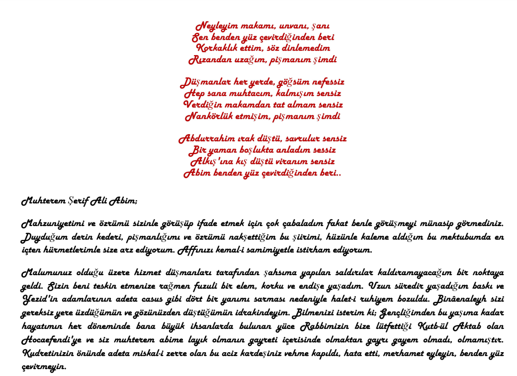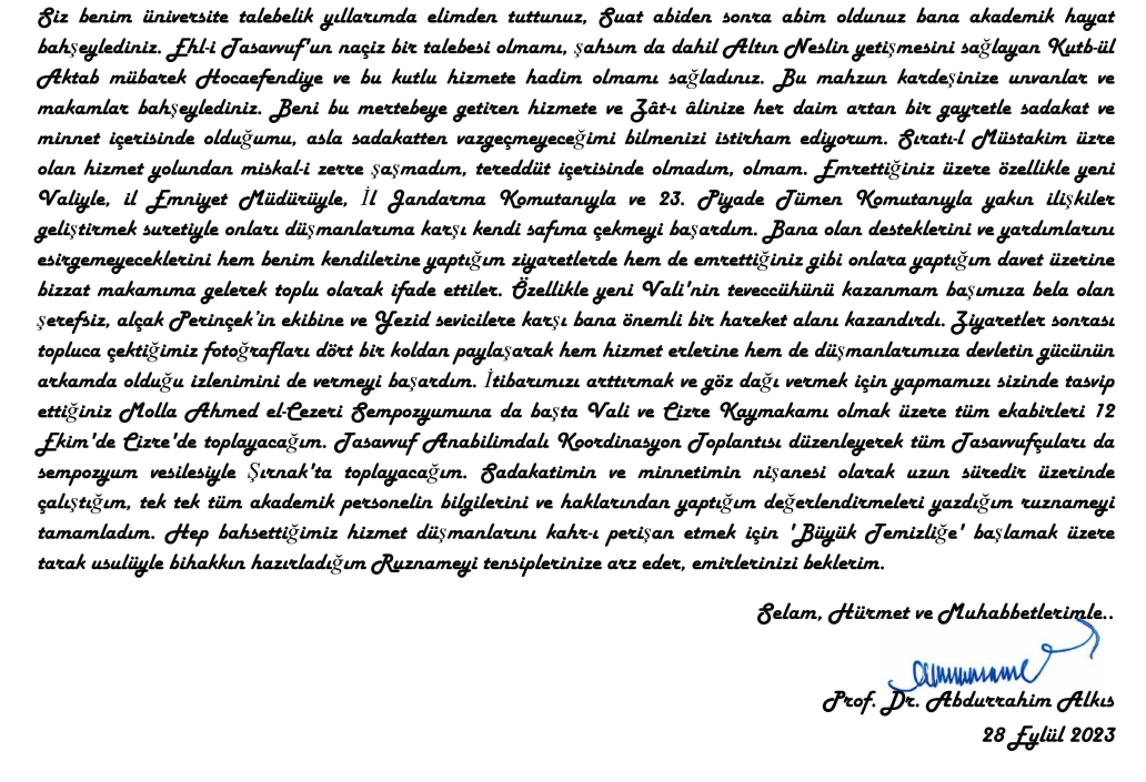 Abdurrahim Alkış, bu ifadeleriyle devletimizin Şırnak’daki en yetkili makamları, Vali’den başlayarak “düşmanlarıma karşı safıma çekmeyi başardım” diyor. Devamında ise “bana olan desteklerini ve yardımlarını esirgemeyeceklerini hem benim kendilerine yaptığım ziyaretlerde hem de emrettiğiniz gibi onlara yaptığım davet üzerine bizzat makamıma gelerek toplu olarak ifade ettiler.”
