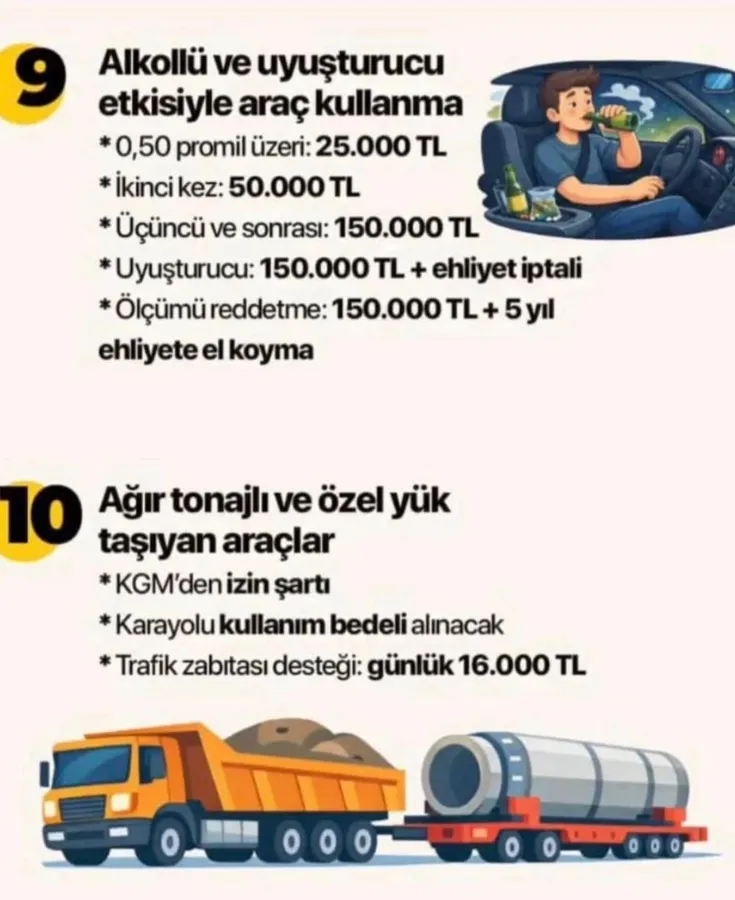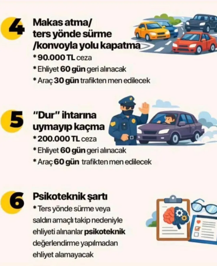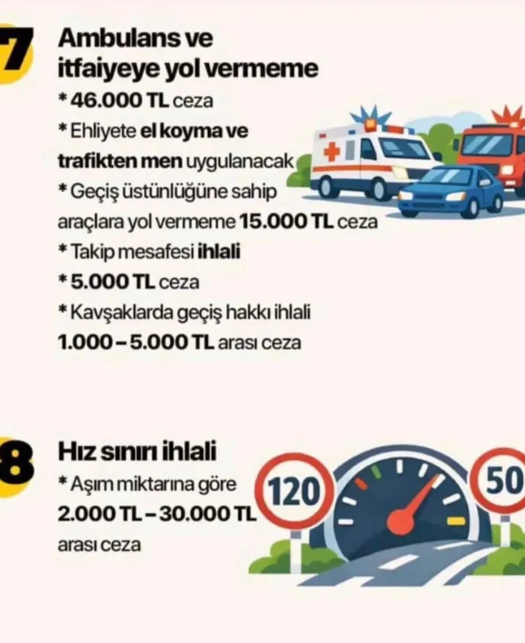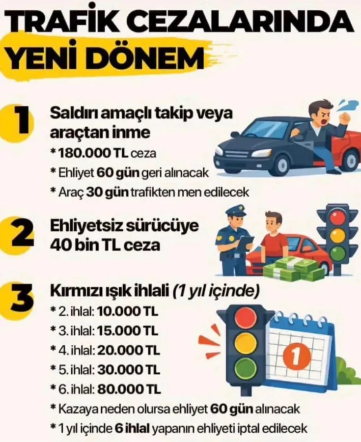 Trafik güvenliğinin sağlanması ve vatandaşlarımızın bilinçlendirilmesi amacıyla, trafik ihlallerine uygulanacak yeni cezalar ve ceza tutarları kamuoyuyla paylaşılmaktadır.