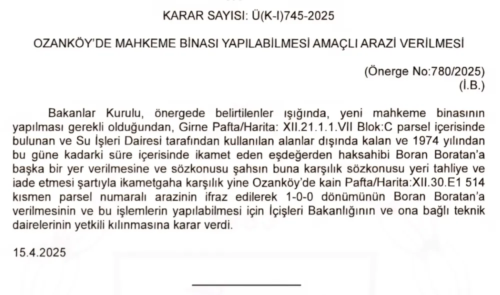 "Bakanlar Kurulunun Ü(K-1) 745-2025 sayılı “Ozanköy`de mahkeme binası yapılabilmesi amaçlı arazi verilmesi” başlıklı 15 Nisan 2025 tarihli kararını, aylar sonra, bir sivil toplum örgütünün temsilcilerini kabulü sırasında ÜZÜLEREK öğrendim.