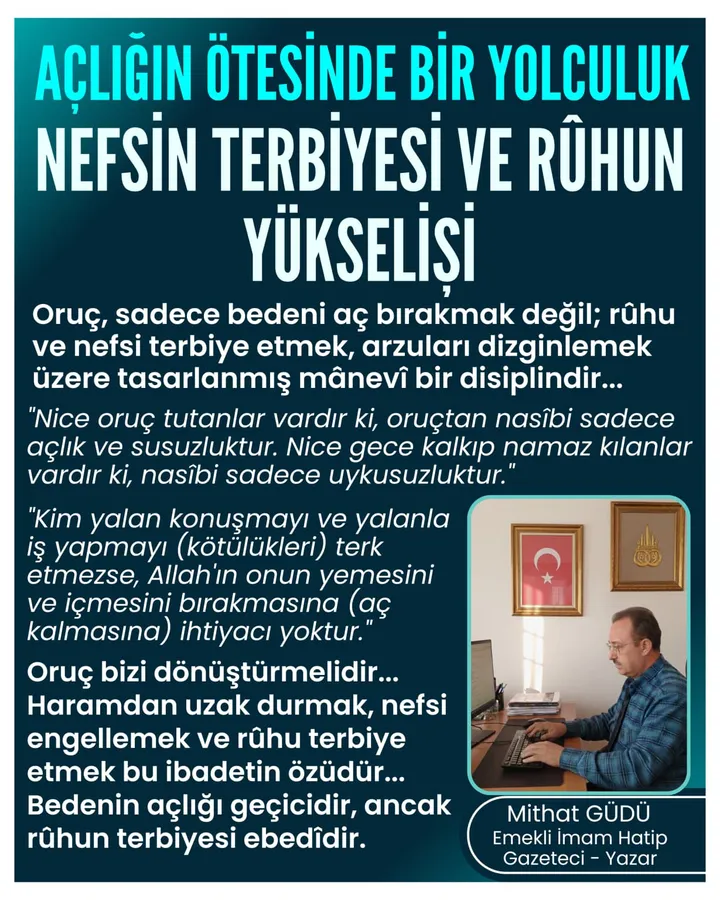Oruç sadece bir ibadet değil, bir hayat dersidir. Peygamber Efendimiz’in buyurduğu üzere, oruç bizi dönüştürmelidir. Haramdan uzak durmak, nefsi engellemek ve rûhu terbiye etmek bu ibadetin özüdür. İftar sofrasına oturduğumuzda sadece susuzluğumuzu değil; aynı zamanda egolarımızı, öfkelerimizi ve bencilliğimizi de dindirmeliyiz.