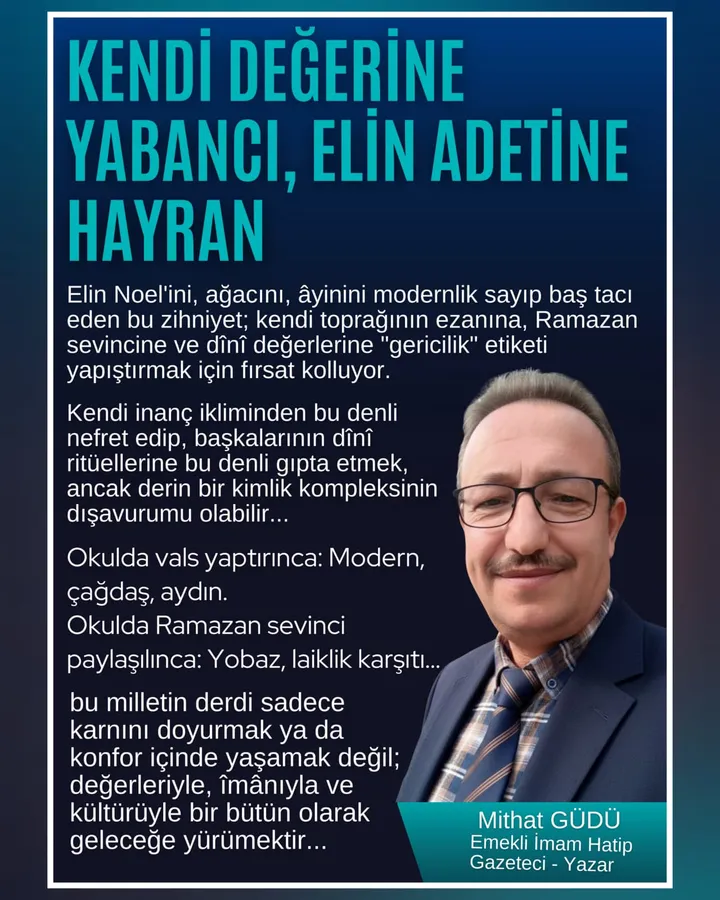 İşin en acı ve düşündürücü tarafı şu: Bizim ülkemizde kendi dînine ve dînî değerlerine gösterilen bu sistemli karşı çıkışı, bugün bir Hristiyan ülkesinde bile göremezsiniz. Avrupa’nın en seküler başkentlerinde Noel kutlamaları şehri kuşatır; okullarda koro âyinleri yapılır, kilise çanları eşliğinde ritüeller düzenlenir. Hristiyan dünyası için bu, inançlarının bir gereği ve son derece doğal bir kültürel reflekstir. Orada kimse çıkıp "Modernlik elden gidiyor!" diye feryat etmez; aksine kendi köklerine sahip çıkmayı bir "medeniyet göstergesi" olarak selâmlarlar. Ancak ne hikmetse, Batı'daki bu dînî muhafazakârlığa hayranlık duyup "saygı" duyanlar, mesele Müslüman Türk kültürünün bir parçası olan Ramazan'a gelince birden bire "aydınlanmacı" kesiliyorlar. Elin Noel'ini, ağacını, âyinini modernlik sayıp baş tacı eden bu zihniyet; kendi toprağının ezanına, Ramazan sevincine ve dînî değerlerine "gericilik" etiketi yapıştırmak için fırsat kolluyor. Kendi inanç ikliminden bu denli nefret edip, başkalarının dînî ritüellerine bu denli gıpta etmek, ancak derin bir kimlik kompleksinin dışavurumu olabilir.