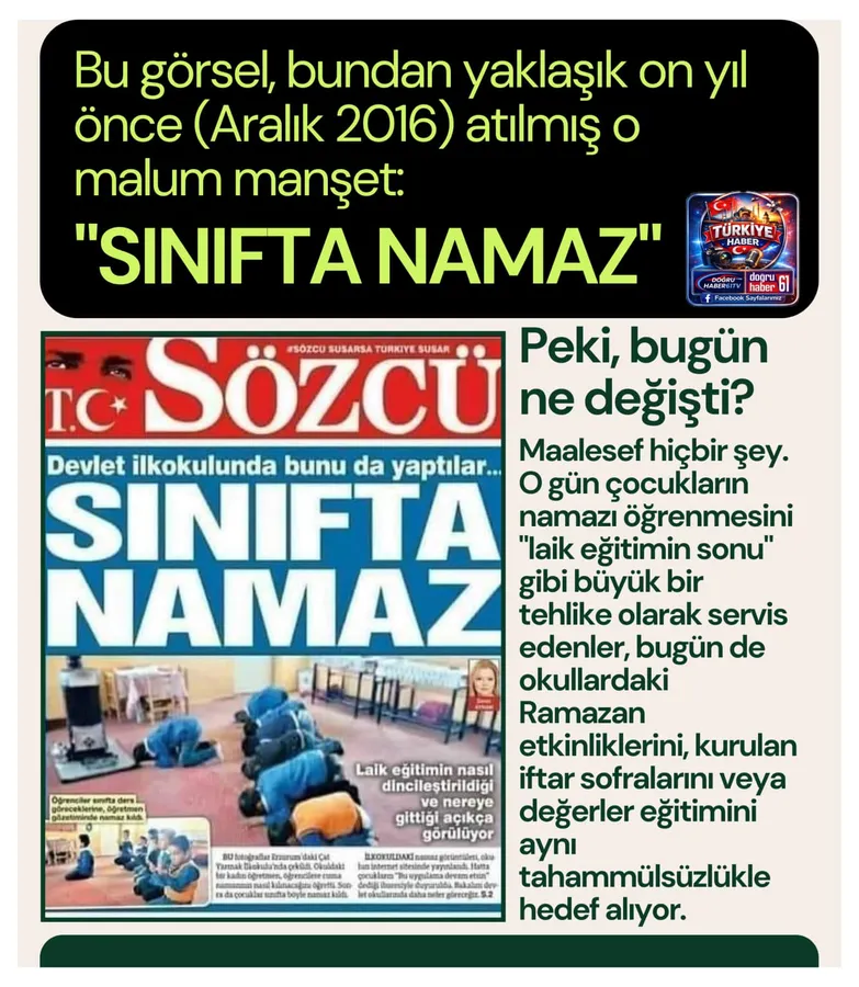 ​Bu görsel, bundan tam 10 yıl önce (Aralık 2016) Sözcü Gazetesi’nin attığı o malum manşet: "Sınıfta Namaz". Erzurum’un Çat ilçesindeki bir köy okulunda, çocukların öğretmenleri eşliğinde namazı öğrenmesini "laik eğitimin sonu" gibi büyük bir tehlike olarak servis etmişlerdi.