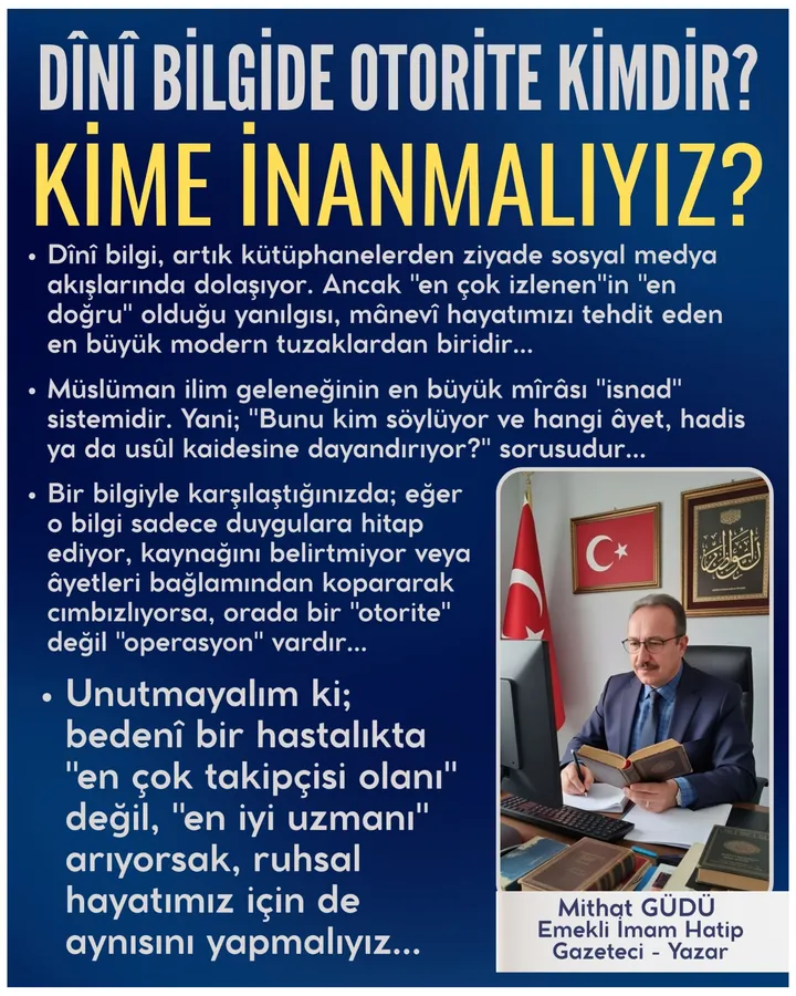 Geleneksel dönemde dînî otorite; icâzeti olan, bir silsileye dayanan ve ahlâkıyla temâyüz etmiş âlimlerdi. Bugün ise otorite, algoritmalara ve "beğeni" sayılarına kaymış durumda. İşte bu karmaşada doğru bilgiyi ayırt etmenin altın kuralları:
