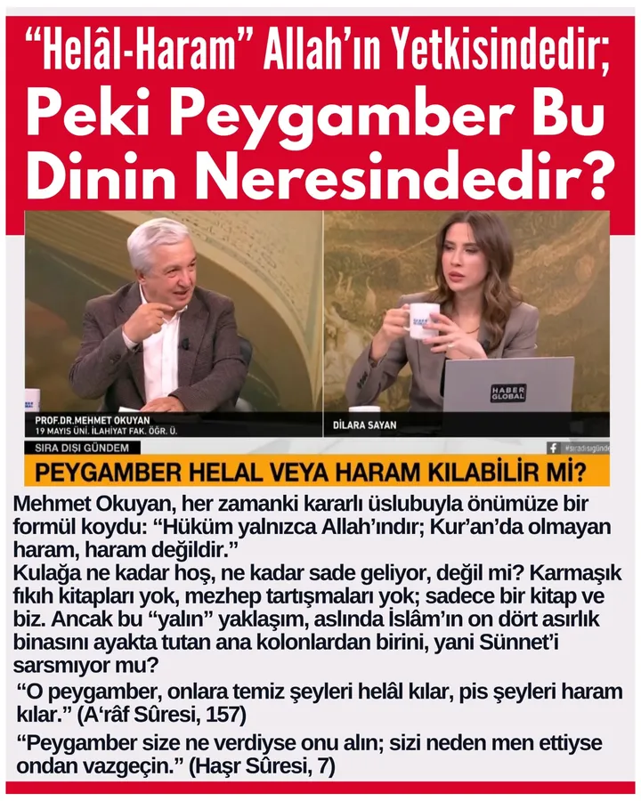 Haber Global ekranlarında yayımlanan “Sıradışı Gündem” programında sunucu Dilara Sayan’ın Prof. Dr. Mehmet Okuyan’a yönelttiği sorulara verdiği cevapları dinlerken, bu söylemlerin ekran başındaki pek çok kişide oluşturduğu etkiyi ve uyandırdığı tartışmaları gözlemlemek mümkündü. Okuyan, her zamanki kararlı üslubuyla önümüze bir formül koydu: “Hüküm yalnızca Allah’ındır; Kur’an’da olmayan haram, haram değildir.”