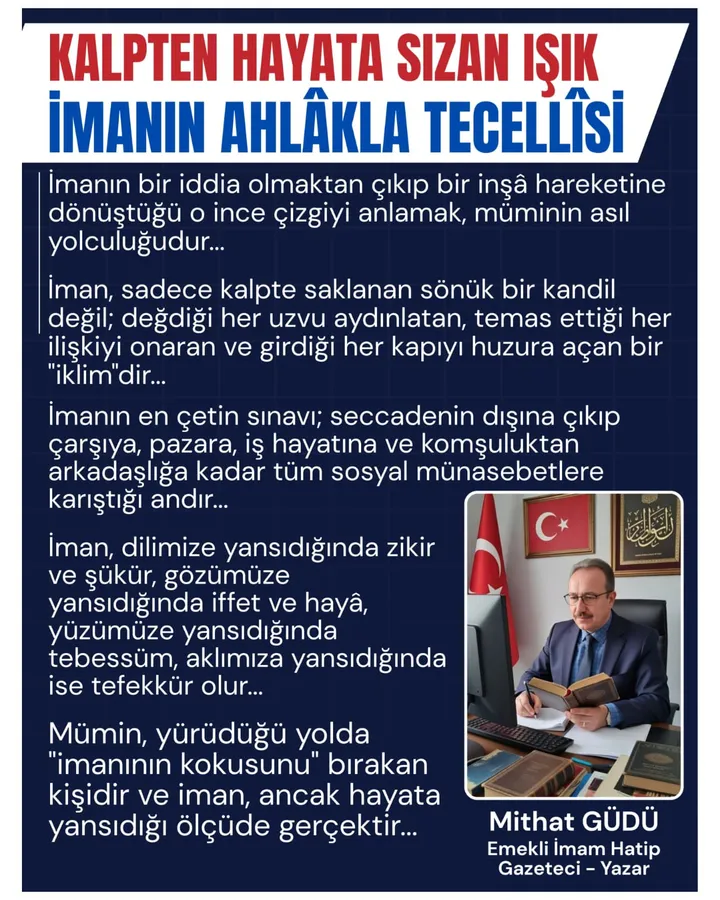 Îman, sadece kalbin kuytu köşelerinde saklı kalan soyut bir inanç değil; hayatın her zerresine nüfûz etmesi gereken kuşatıcı bir "ahlâk nizamı"dır. İbadetin camiye, ticaretin çarşıya, ahlâkın ise raflardaki kitaplara hapsedildiği bu çağda; asıl mesele, değerlerimizin hayatın her köşesinde ne kadar vücut bulduğudur." İmanın bir iddia olmaktan çıkıp bir inşâ hareketine dönüştüğü o ince çizgiyi anlamak, müminin asıl yolculuğudur. Çünkü iman, sadece kalpte saklanan sönük bir kandil değil; değdiği her uzvu aydınlatan, temas ettiği her ilişkiyi onaran ve girdiği her kapıyı huzura açan bir "iklim"dir.