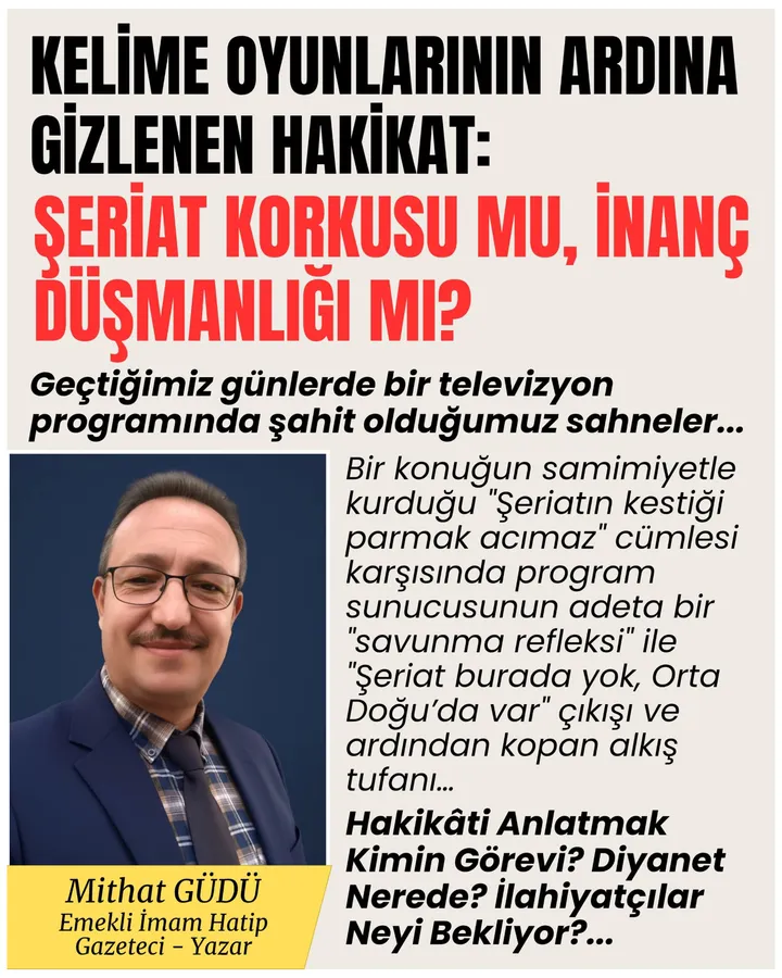 Şeriatı sadece "Orta Doğu"ya has bir öcü gibi gösterip alkış toplamak, bu milletin inancına karşı girişilmiş bir algı operasyonudur. Halkın inancını küçümseyen, dini kavramları nefret objesi haline getiren bu söylemleri şiddetle kınıyoruz.