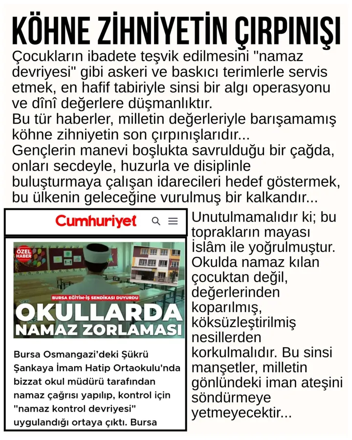 Cumhuriyet'in web sayfasında manşete taşıdığı "Okullarda Namaz Zorlaması" başlıklı haber, Türkiye’de on yıllardır değişmeyen bayat bir senaryonun yeniden vizyona sokulmasından başka bir şey değildir. Bir İmam Hatip Ortaokulu’nda, yani isminde "İmam" ve "Hatip" ibaresi bulunan, kuruluş amacı dînî değerleri öğretmek olan bir eğitim kurumunda, çocukların ibadete teşvik edilmesini "namaz devriyesi" gibi askerî ve baskıcı terimlerle servis etmek, en hafif tabiriyle sinsi bir algı operasyonu ve dînî değerlere düşmanlıktır.