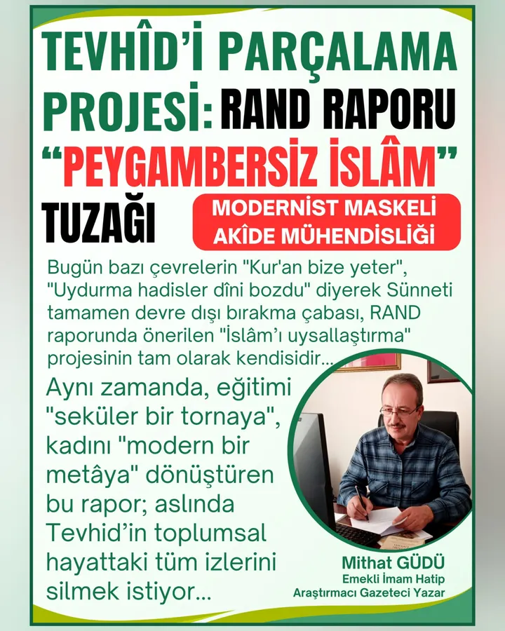 Bugün bazı çevrelerin "Kur'an bize yeter", "Uydurma hadisler dîni bozdu" diyerek Sünneti tamamen devre dışı bırakma çabası, RAND raporunda önerilen "İslâm’ı uysallaştırma" projesinin tam olarak kendisidir.