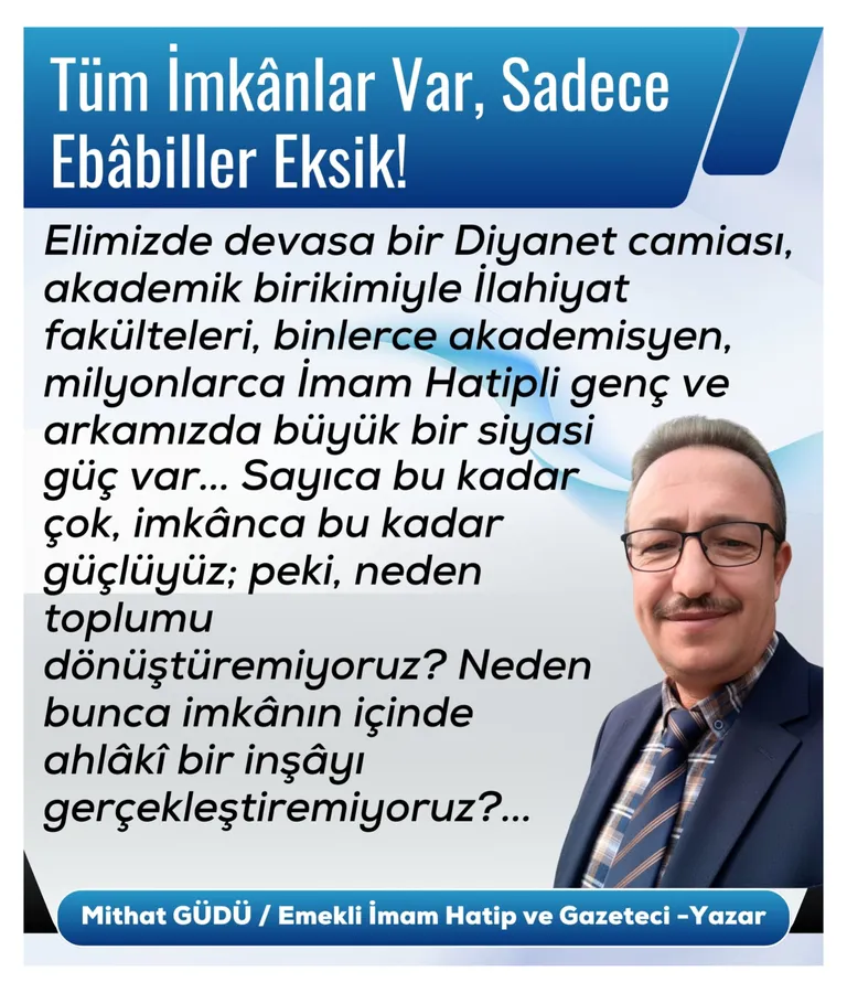 ​Ebâbil kuşlarını beklemeye gerek yok; zira Allah bize her türlü imkânı verdi. Eksik olan taşlar değil, eksik olan; o taşları yerli yerine koyacak, dosdoğru bir ahlâk ve samimiyettir.