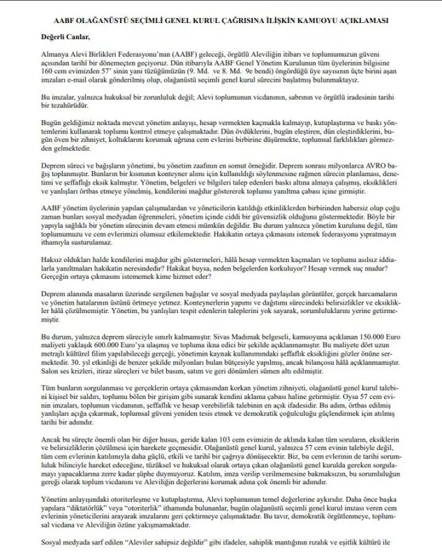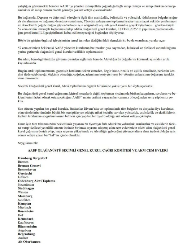 Almanya Alevi Birlikleri Federrasyonu’nun 18 Ekim 2025 tarihinde yapılması planlanan olağan genel kurulu seçimli değil. Ancak, talep yeter sayısı tüzüğe göre sağlandığı içini, yönetim kurulunun 18 Ekim’deki olağan genel kurulu olağanüstü seçimli genel kurula çevirmesi bekleniyor. AABF genel merkezinden haber sitemize ulaşan bilgilere göre, Hüseyin Mat ve çevresi olağanüstü seçimli genel kurula kesinlikle karşılar. Bunu önleyebilmek için imzacı cemevlerine baskı uygulayarak imzalarını geri çekmelerini sağlama çabaları sonuç vermezse, ne olacak? Mat ve ekibi AABF’yi sonunda Alman mahkemelerine taşıyacak gibi görünüyor!