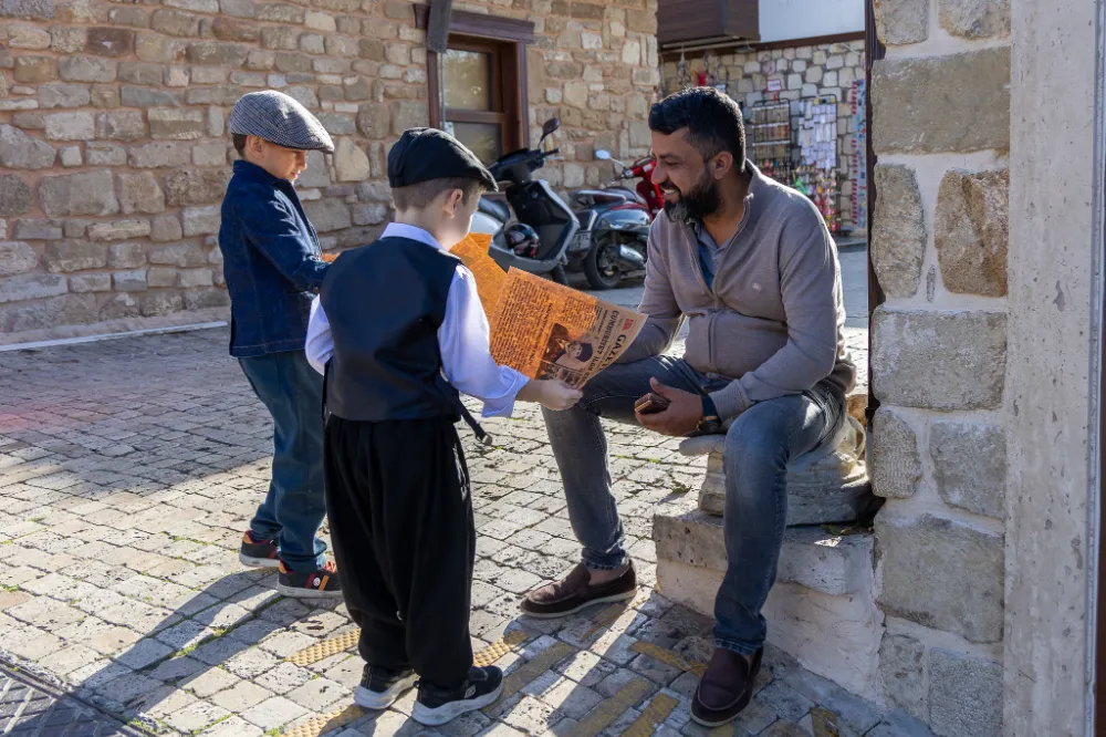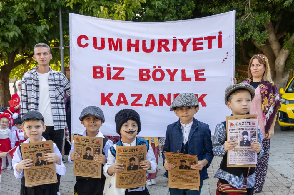 Manavgat’ta 29 Ekim Cumhuriyet Bayramı dolayısıyla düzenlenen etkinlikte, Manavgat Belediyesi Side Kreş ve Gündüz Bakımevi öğrencileri, “Cumhuriyet ilan edildi” manşetli sembolik gazeteleriyle Antik Side sokaklarında vatandaşlara