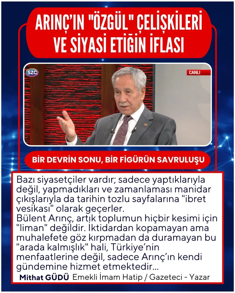 Arınç’ın Sözcü TV’deki o fitne kokan, çelişkili ve tutarsız açıklamaları; bir devlet adamının vakarını değil, bir siyasetçinin hazin irtifa kaybını simgelemektedir.