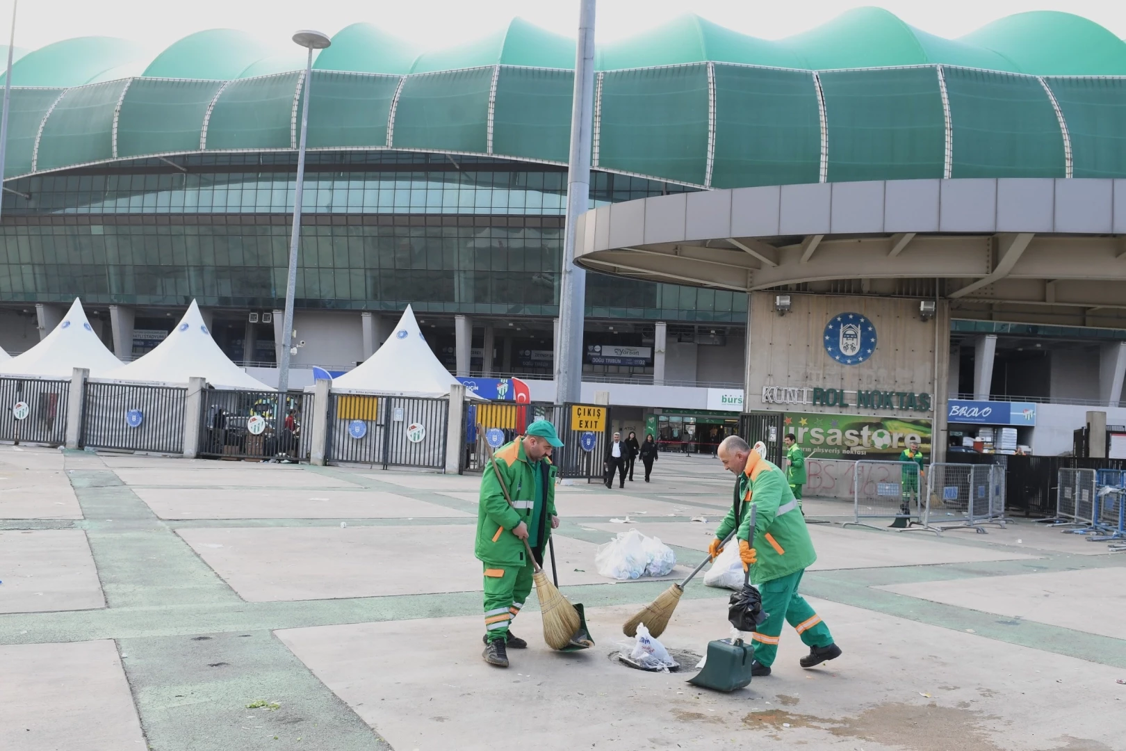 Stadyum çevresinde, koridorlarda ve tribünlerde iki gün boyunca temizlik çalışması yürüten ekipler, 43 bin 361 kişi kapasiteli dev stadyumu baştan aşağı temizleyerek bir sonraki karşılaşma için hazır hale getirdi.