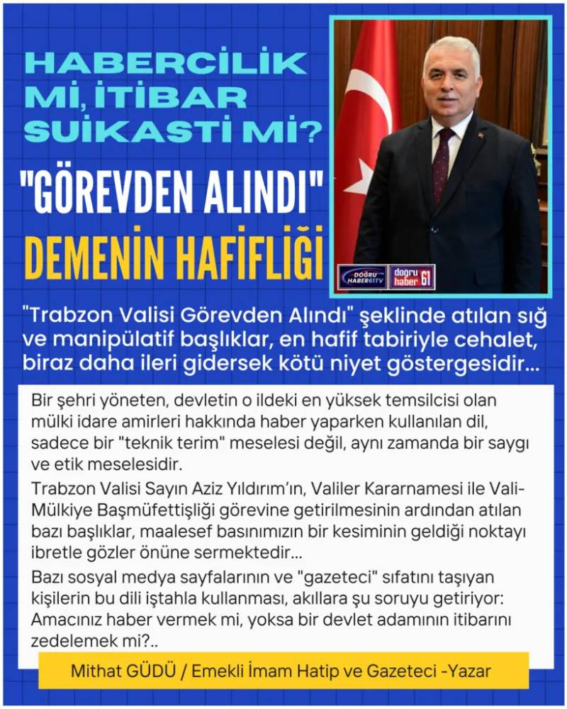 Bir şehri yöneten, devletin o ildeki en yüksek temsilcisi olan mülki idare amirleri hakkında haber yaparken kullanılan dil, sadece bir "teknik terim" meselesi değil, aynı zamanda bir saygı ve etik meselesidir. Trabzon Valisi Sayın Aziz Yıldırım’ın, Valiler Kararnamesi ile Vali-Mülkiye Başmüfettişliği görevine getirilmesinin ardından atılan bazı başlıklar, maalesef basınımızın bir kesiminin geldiği noktayı ibretle gözler önüne sermektedir.