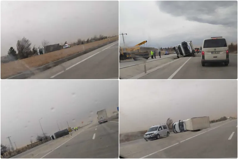 Konya’da şiddetli rüzgâr nedeniyle çok sayıda tır devrildi