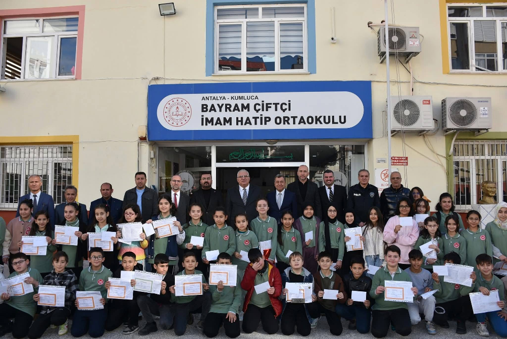 Kumluca’daki karne dağıtım törenlerinin merkez adresi Bayram Çiftçi İmam Hatip Ortaokulu oldu. Kumluca Kaymakamı Bahadır Güneş ve ilçe protokol üyelerinin katılımıyla gerçekleşen törende, öğrencilerin heyecanı gözlerinden okundu. Protokol üyeleri sınıfları tek tek gezerek, öğrencilere karnelerini ve başarı belgelerini takdim etti. Öğrencilerle yakından ilgilenen Kaymakam ve beraberindeki heyet, çocukların tatil planlarını dinleyerek onlara moral verdi.