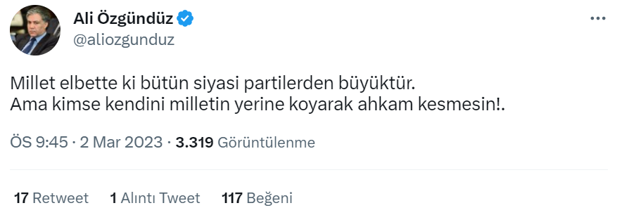 'Millet elbette ki bütün siyasi partilerden büyüktür. Ama kimse kendini milletin yerine koyarak ahkam kesmesin!' dedi.