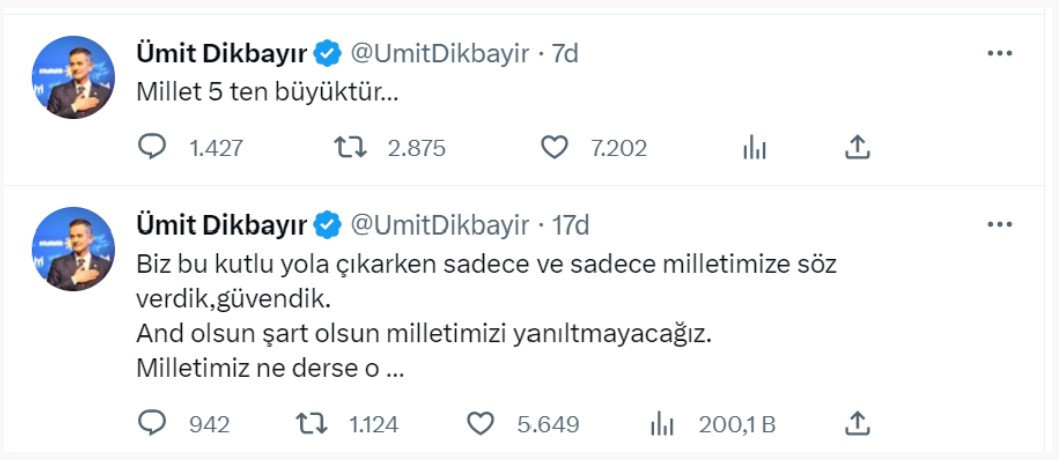İYİ Parti Mali İşler Başkanı ve Sakarya Milletvekili Ümit Dikbayır, Twitter hesabından yaptığı paylaşımda 'Biz bu kutlu yola çıkarken sadece ve sadece milletimize söz verdik, güvendik. And olsun şart olsun milletimizi yanıltmayacağız. Milletimiz ne derse o.' ifadelerini kullandı.