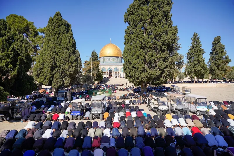 Kudüs'teki İslam Vakıfları Dairesi, yaklaşık 60 bin kişinin Cuma namazını Mescid-i Aksa avlusunda kıldığını tahmin ediyor.