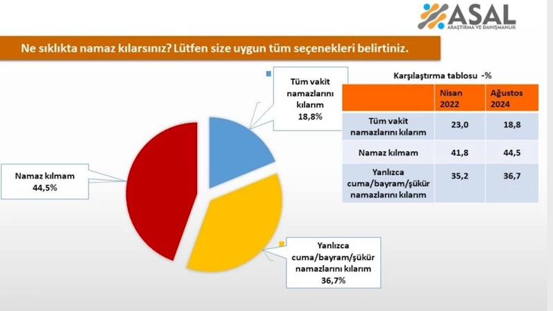 Namaz kılmadığını belirten katılımcıların oranı %44,5 olarak kaydedildi. Bu oran, Nisan 2022'de %41,8 idi. Bu sonuç, namaz kılmayan bireylerin sayısındaki artışın devam ettiğini ve toplumda ibadet pratiğinden uzaklaşan bir kesimin büyüdüğünü gösteriyor.