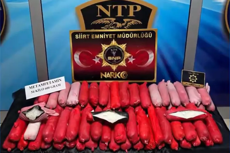 İçişleri Bakanı Ali Yerlikaya, Siirt'in Baykan ilçesinde durdurulan bir çekicide küçükbaş hayvanların karın boşluklarına gizlenmiş 54,6 kilogram metamfetamin ele geçirildiğini açıkladı.
