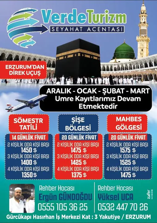 Umre Seyahatlerinizin tek adresi Verde olsun…Verde Turizm Katkılarıyla Umre seyahatleriniz artık daha rahat… Ergün Gündoğdu ve Yüksel Uca rehberliğinde Umre seyahatleriniz daha bir dolu geçecek.