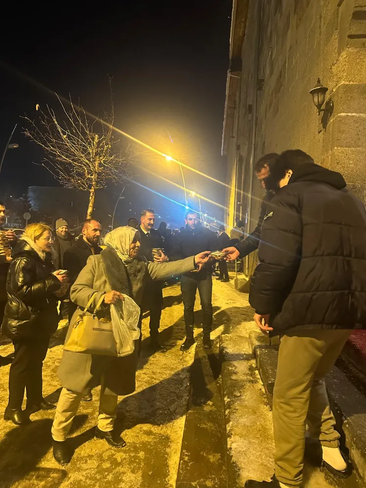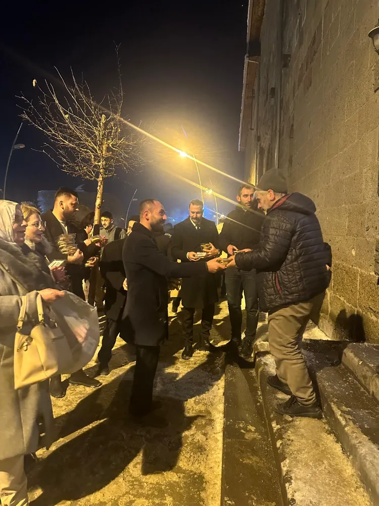 Gündüz gerçekleştirilen esnaf ziyaretlerinin ardından program akşam saatlerinde de devam etti. Yatsı namazı sonrası Ulu Cami önünde vatandaşlara kandil simidi dağıtan Anahtar Parti Yakutiye İlçe Teşkilatı, camiden çıkan vatandaşlarla tek tek selamlaştı, kandillerini tebrik etti.