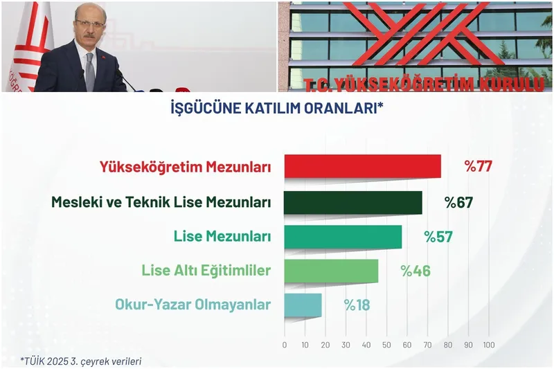 Yükseköğretim Kurulu Başkanı Erol Özvar, tablonun yükseköğretimin istihdam odaklı vizyonunu desteklediğini belirterek "Eğitim düzeyleri yükseldikçe işgücüne katılım ve istihdam edilme oranları da aynı paralelde artıyor. Yükseköğretim, bireylerin sadece akademik yetkinliklerini değil ekonomik sisteme entegrasyon kapasitelerini de güçlendiren en önemli araç." değerlendirmesinde bulundu. (İLKHA)